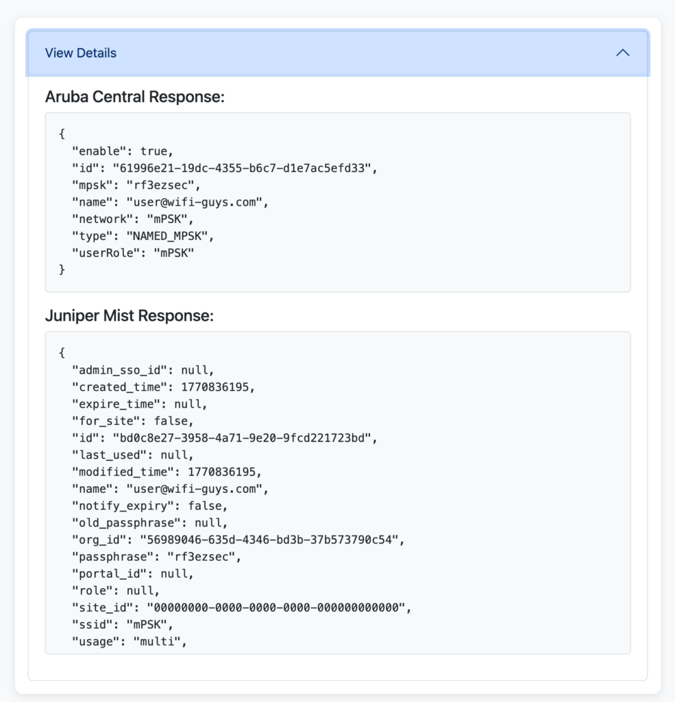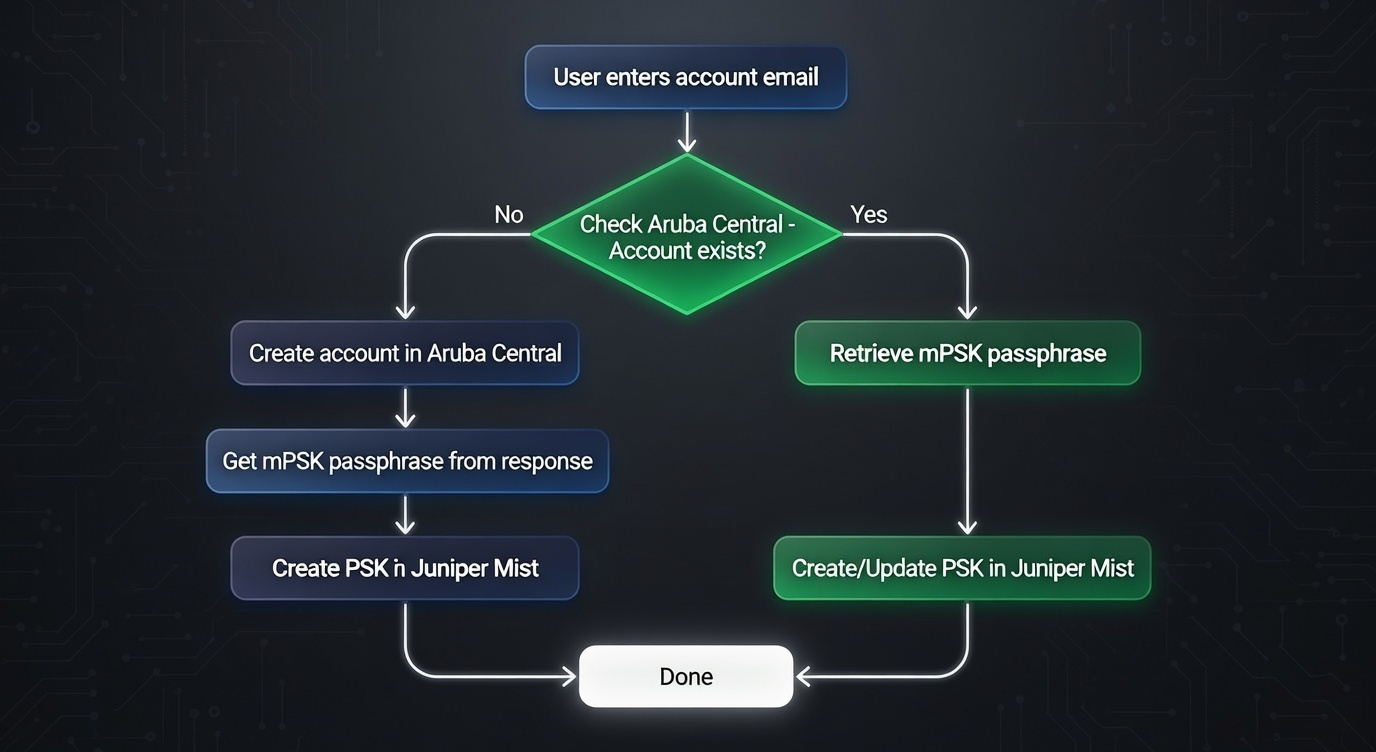 - Aruba Central Check: The app queries Aruba Central to determine if an mPSK account already exists for that email.