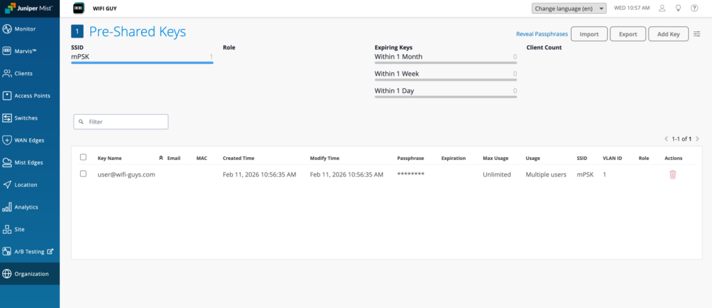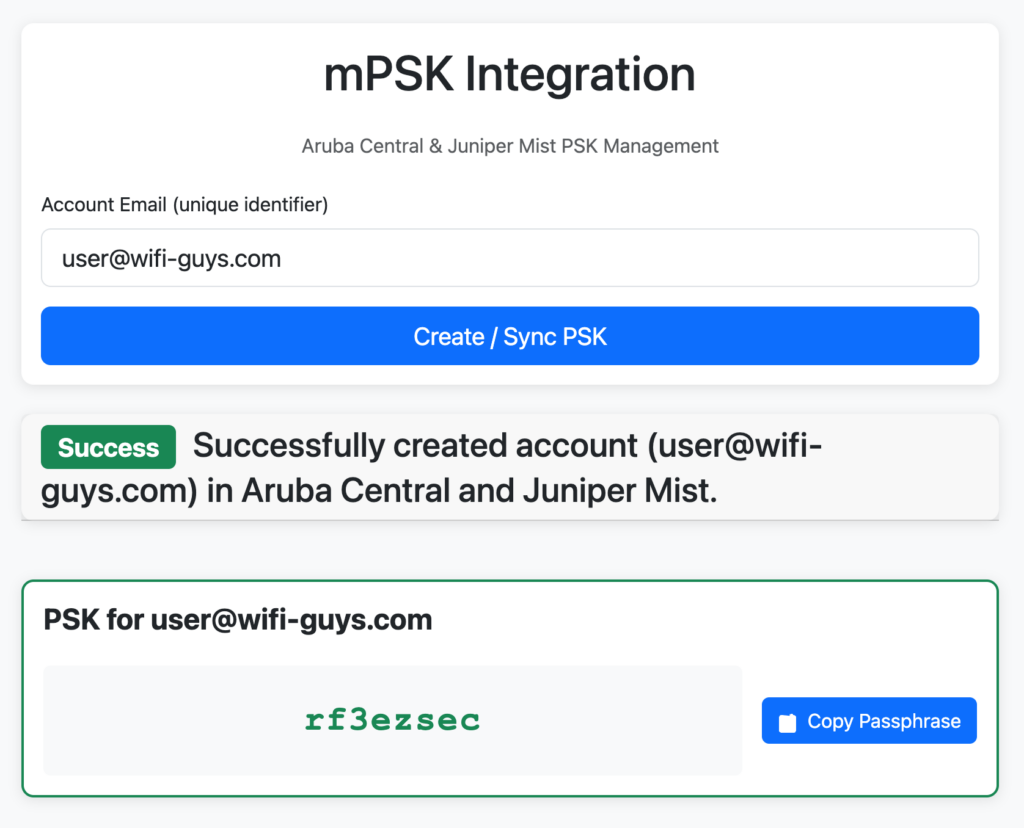 - Creates or updates the matching PSK entry in Juniper Mist using the same passphrase.
